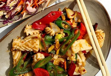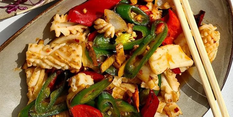 Calamar iute amorțit şi salată chinezească. Un prânz uşor şi delicios, la La 𝐑𝐞𝐬𝐭𝐚𝐮𝐫𝐚𝐧𝐭 𝐙𝐀𝐎.